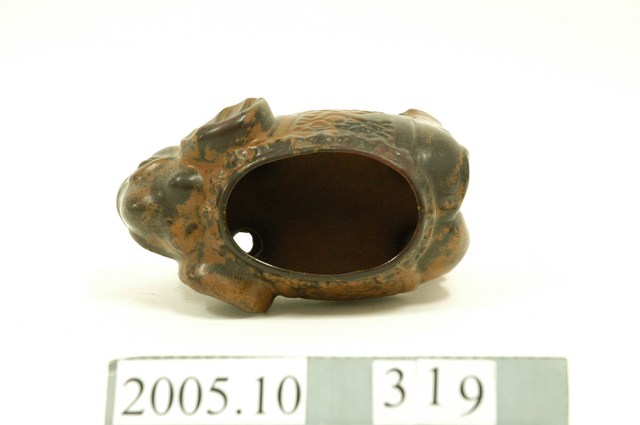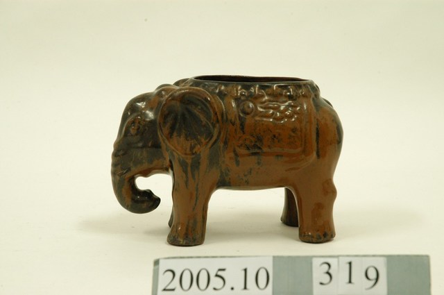 1.本件大甲東窯陶製褐黑釉象形花器通身以陶土壓模製作,於表面施以黑、褐雙色釉料,以自然混和流淌的方式裝飾表面器身。花器外型作大象全身造型,作象背開口,口緣呈長橢圓形立口,口部略為內縮。另於象身兩側裝飾有象鞍,其底足為圓柱狀四肢象足,於底足左前肢處底部帶有圓形透孔,可作排水之用。本件花器主要作盆栽使用,同時兼具裝飾功能,可種植花草與小型植物。2.大甲東窯因位於大甲東社而得名,其地區因湖泊沉積大量優質黏土,製作出的陶器耐高溫燒製,且硬度高,質地優良。1902年福州陶藝師林景洄於當地設立窯場,傳授製陶技術,所