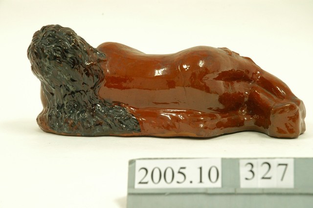 1.本件南投窯褐釉裸女陶枕通身以陶土壓模製作,外表施以褐色釉料後燒製完成。外型呈長橢圓形底座,上方以全裸女性側身橫躺姿態,左手輕撐頭部,右手置於腰部輕觸地面,女性頭部略微向上仰望,頭髮以黑色釉料裝飾。2.早期南投所產陶器,陶土質地具有彈性、黏性高、深紅結實。其燒製陶器㪋分為粗陶器與細陶器兩大類。細陶器多為富有人家訂製或特殊要求燒製,數量較為稀少。日用陶器大體為粗陶大宗,如缸、甕、罐、缽等,且素燒比釉燒更為普遍。本件陶枕除可做寢具使用,也兼具擺設美化空間之功能,陶枕做工細緻,為細陶器種類。