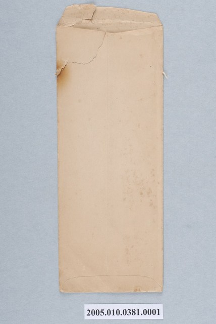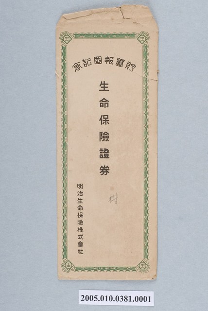 1.本物件為明治生命保險株式會社信封」。為明治生命保險株式會社的保險資料信封,正面印有文字,最上面一排由右至左為「貯蓄報國記念」,中央直牌文字為「生命保險證券」,左下直牌文字為「明治生命保險株式會社」,信封周邊為綠色的花邊圖紋,四個角各有一個「生」字。中央偏右下有一鉛筆字「樹」,信封右上角有撕破的裂痕。背面無圖案,左上角有一污漬。