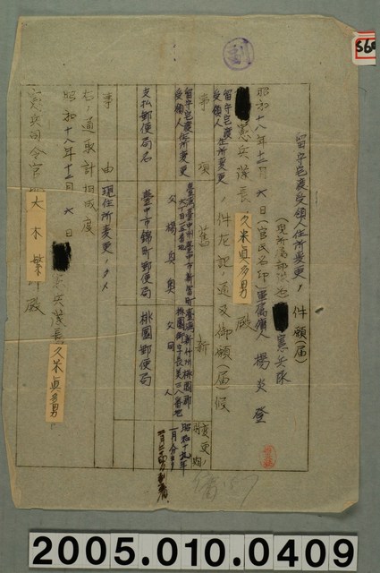 2005.010.0409 昭和18年留守宅渡受領人住所變更