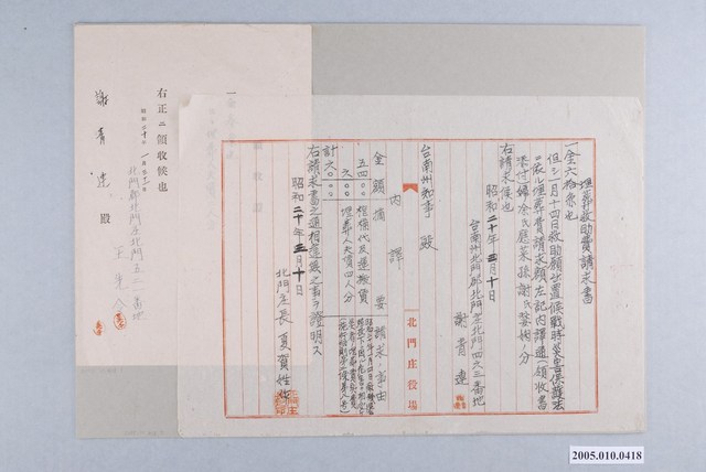 本件為昭和20年(1945)4月10日,謝青連呈臺南州知事之埋葬救助費請求書與埋葬費領收證(收據)。北門郡北門庄謝青連曾於昭和20年1月14日時,依戰時災害保護法向臺南州知事宮尾五郎請求埋葬費補助,項目為棺桶及搬運費54圓,埋葬人夫費6圓,金額合計60圓;同時,謝青連亦附上昭和20年(1945)1月31日,北門郡北門庄王先令給其之領收證,內容為支付埋葬人夫賃2人份3圓。以此為附件向臺南州知事請求埋葬費補助。