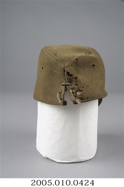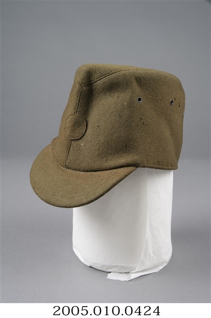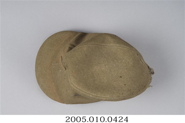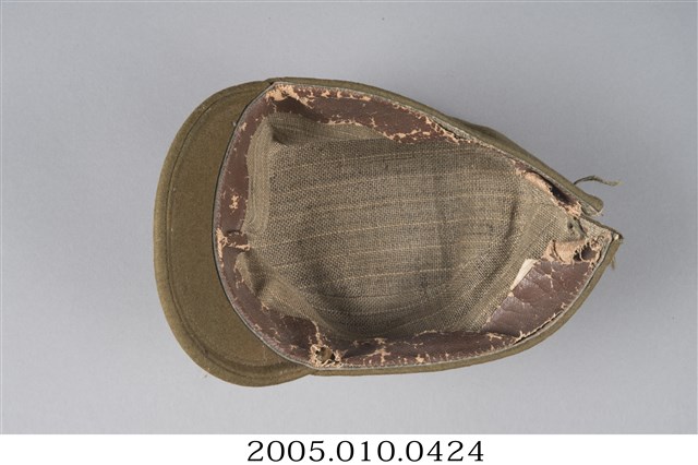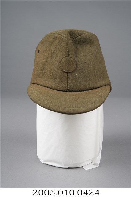 1.此件日本陸軍軟帽為軍綠色,帽子沒有骨架,十分柔軟,方便折疊攜帶,也可戴在鋼盔內。帽子後方有綁繩可調節帽圍。此軟帽原本在帽子正前方縫有一紅色圓形布,用以象徵日本,然目前已經脫落佚失。帽絆與帽釘也脫落佚失。帽子內緣皮革也有些許磨損、脫線。2.此種陸軍軟帽相比大盤帽,配戴更加舒適且成本較低,所以很快普及。