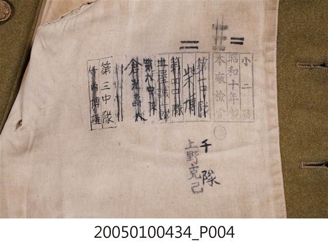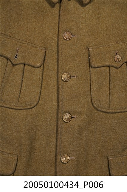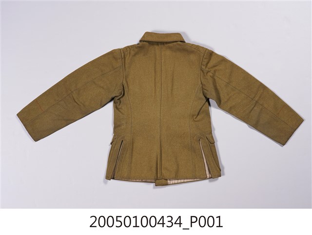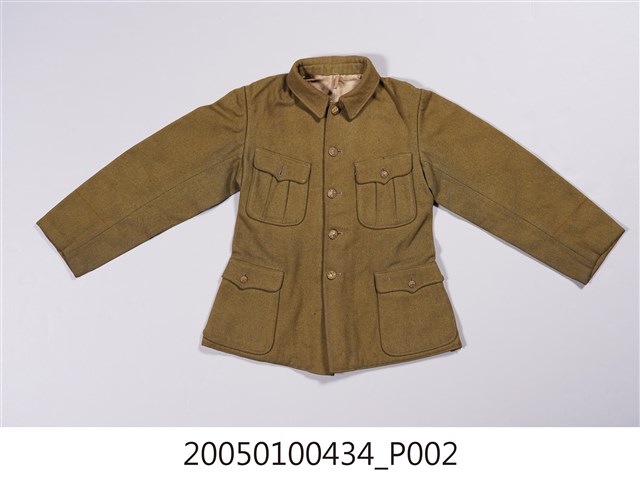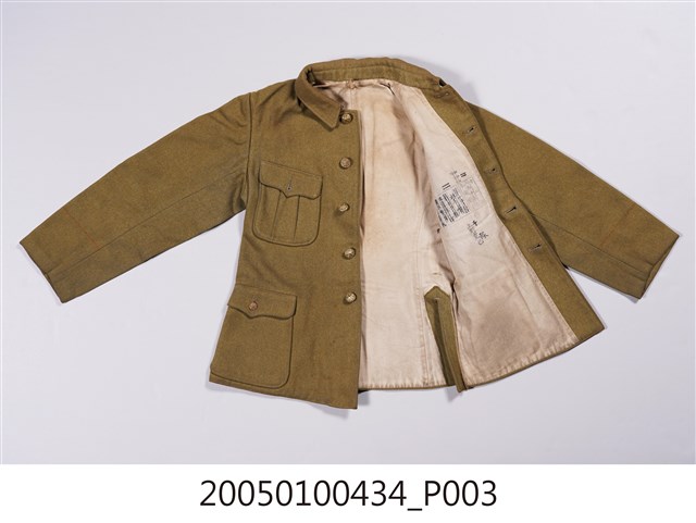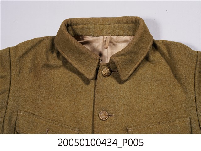 1.此件憲兵上衣為毛呢布料製作,以雙層布料製作而成的前開襟外套,內層為淡褐色的裡布,前、後身片沒有剪接,衣身寬大呈A字型輪廓。領子為襯衫領(立領上加向下反折的領子),前門襟縫五顆有櫻花圖樣的金色鈕釦,前身片左右兩邊與胸前各一個貼式口袋加袋蓋(共四個口袋),袋蓋上也有櫻花圖樣的金色鈕釦。整件服裝以縫紉機車縫製作,袖子為二片袖,可使袖管不至於太大又有活動量,此種內、外袖常用於外套的服裝結構。2.日本憲兵常稱作憲兵隊(日語Kempeitai),隸屬於日本帝國的陸軍,存在於1881年至1945年。日本憲兵的任務,根據憲兵條例第一條:「憲兵作為陸軍軍紀的代表,擔任軍內軍紀的巡查和檢察的任務,監督軍人的日常品行;兼任行政警察和司法警察。」