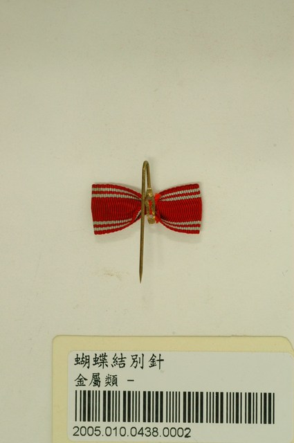 1. 本物件為蝴蝶結別針。與勳章緞帶同色系的紅色緞帶製成的蝴蝶結,中間綁有一別針。