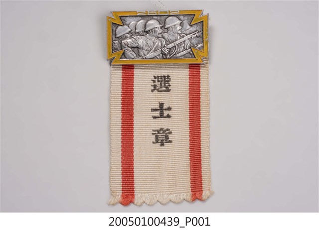 本物件為大日本學徒體育振興會選士章,上下分為金屬與織品兩種材質,上部分為鐵製軍人拿槍圖外框為黃色上方印有白字「2602」;下部分為紅色織品,左右兩邊染有紅色線條,正中間印有黑字「選士章」。