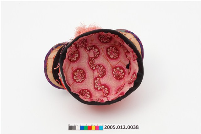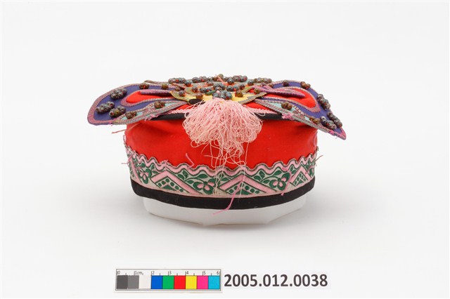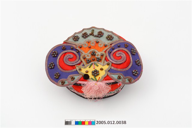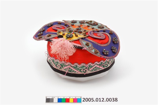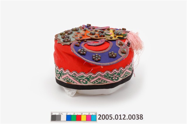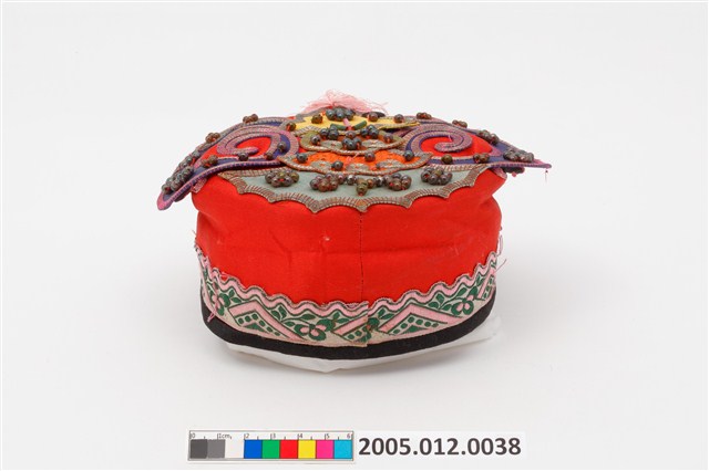 2005.012.0038 紅地盤金珠飾刺繡碗帽
