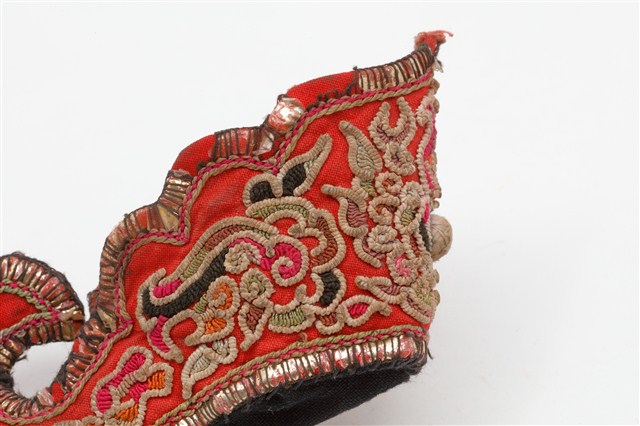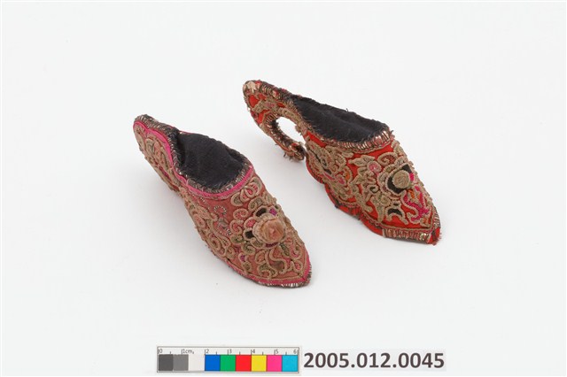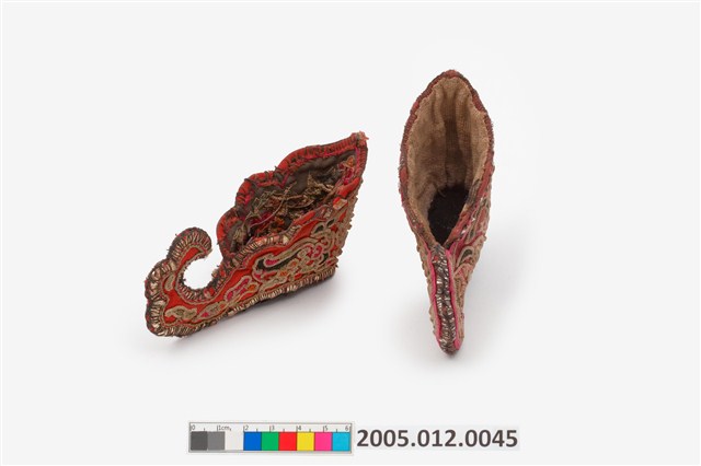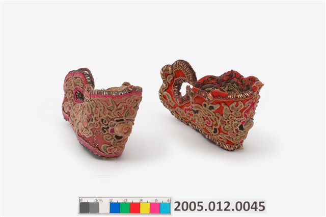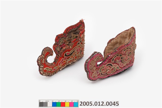2005.012.0045 大紅桃紅色地繡花翹頭嬰兒鞋