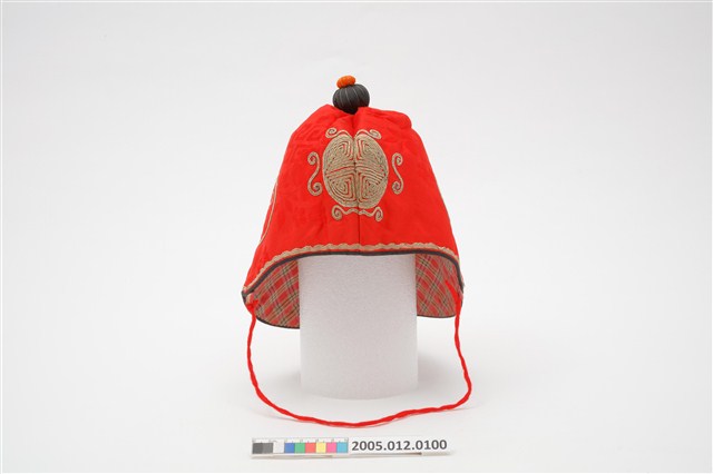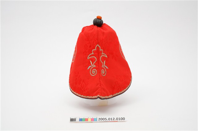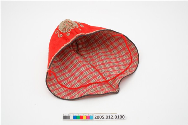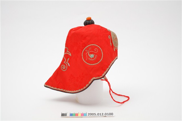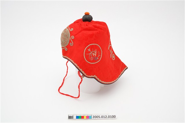 2005.012.0100 大紅地黑球頂盤金繡風帽