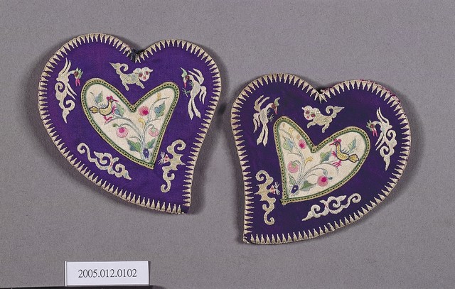 2005.012.0102 紫緞心型錦雞紋耳罩組