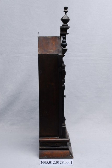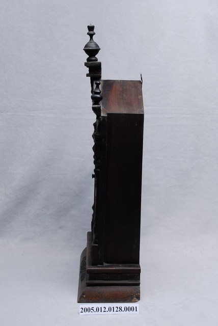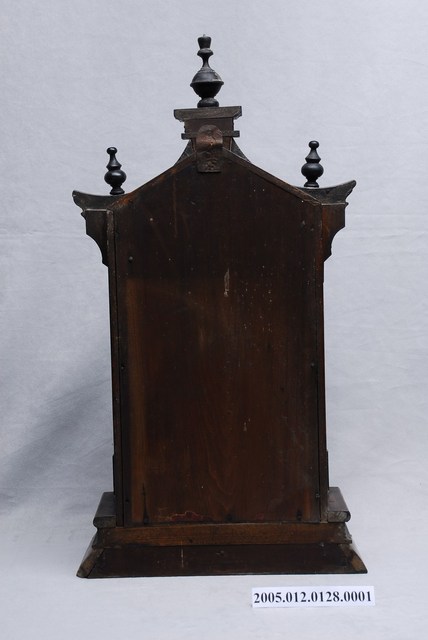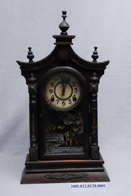 日本尾張時計株式會社製彩繪花鳥玻璃尖頂式木座鐘,座鐘盒體呈扁狀長方體,頂端作三角屋頂設計。盒體之上固定一塊中央挖半圓拱型的木板,木板上方再貼以木雕裝飾作為門面。門面頂端呈人字形尖頂,尖頂中央及兩側立有瓶型木飾;門面左右以對稱立柱為飾,左側柱體嵌入氣壓計,右側柱體置入溫度計。座鐘採用單側右開門設計,門框外觀為半圓拱型,框內夾帶相同形狀的透明玻璃,玻璃下方有彩繪花鳥圖樣。門內上方固定圓形文字板,板上以阿拉伯數字指示時間,數字4及8下半部有發條孔洞,數字12下方印有日本尾張時計株式會社的商標圖樣,商標兩側有文字「TRADE MARK」。文字板後方裝有機芯,機芯下方為敲鐘裝置,敲鐘裝置後方木板貼有產品標籤。