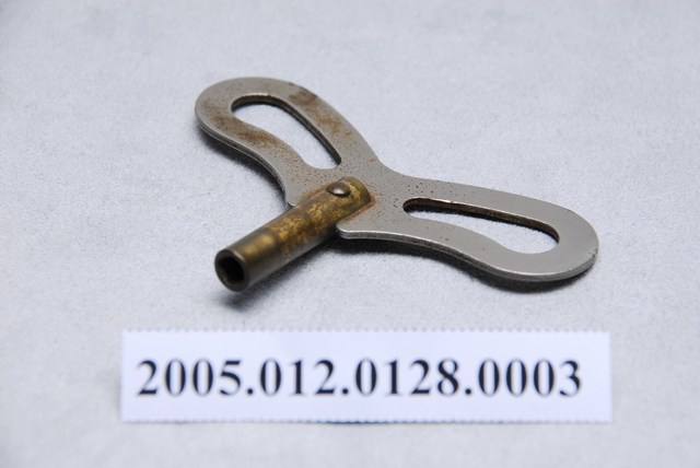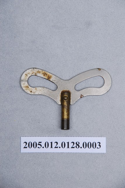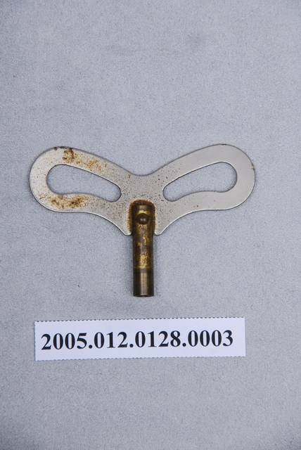 尖頂式木座鐘發條鑰匙,金屬製,尺寸為長7.5公分,寬5公分,厚0.8公分,外觀呈Y字型,依結構可分為轉柄及套筒兩部分。轉柄以鐵製成左右對稱穿孔的扁平狀,下方以卡榫連接固定圓柱狀套筒。套筒筒身為黃銅製,內部呈中空柱狀,用來插入座鐘文字板上的發條孔洞,藉由旋轉發條手動上鍊,給予座鐘走時及報時的動力。