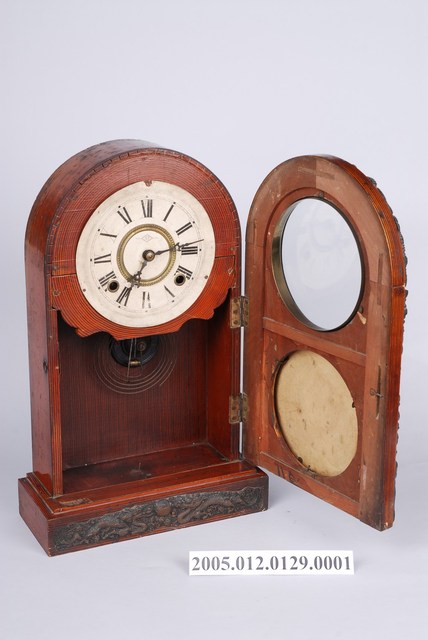 童子嬉戲木座鐘,盒體通身以木材製成,外觀呈半圓拱型,正面作單側右開門設計,門框周圍繞以童子嬉戲圖及花草造型銅片為飾,中央開有兩個圓形透孔,上半部加裝透明玻璃以顯示時間,下半部搭配玫瑰花葉圖樣作為裝飾,門框與兩圓孔間的空隙貼有四枚三角造型銅片。盒體之下以長寬略大於盒體的長方塊製成底座,底座正面飾以雙龍戲珠銅片。門內上半部半圓處嵌入圓形文字板,文字板中央有一黃銅製立體圓環,圓環內印有以菱形及花體字KL組成的商標,商標左右有文字「TRADE MARK」;圓環外以羅馬數字指示時間,數字IIII(4)及VIII(8)旁有發條孔洞。
