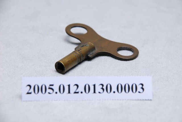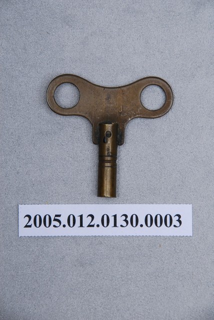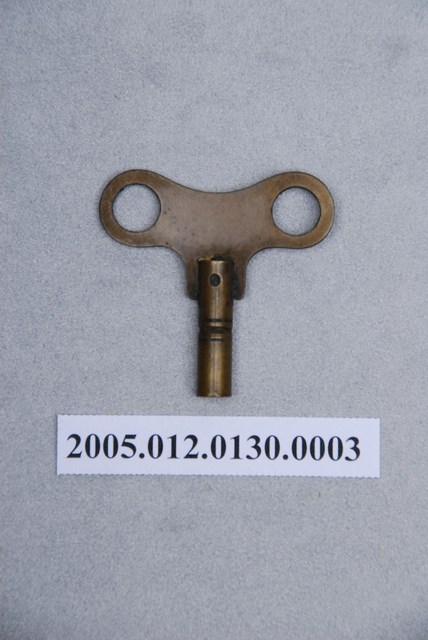 本件發條鑰匙為日本尾張時計株式会社製哥德風格木屋造型掛鐘組的部件之3,通身以黃銅製作而成,整體外觀呈現T字形,可分為轉柄與套筒身。轉柄呈現扁平片狀,左右側帶有圓形透孔,中央下方切割一道卡榫。套筒身呈圓柱狀,頂端同樣切割有一道卡榫與轉柄接合固定,筒身刻有3道環型線條,底端為中空筒狀,用來插入掛鐘的發條孔洞,旋轉以上緊發條。