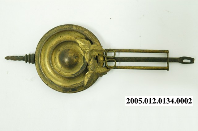 本件八角掛鐘鐘擺為日本明治時計株式會社製八角木質掛鐘組的部件之2,鐘擺可分為桿身與擺球兩部分,桿身金屬製,頂端有一孔可勾掛於機芯下方,擺球為黃銅製,表面並有凹圓裝飾,上方還有銅片葉形透雕。擺錘擺動主要受距離影響,時間快慢係透過擺錘下方之螺帽來調整擺錘高度,以補正擺動旋律。