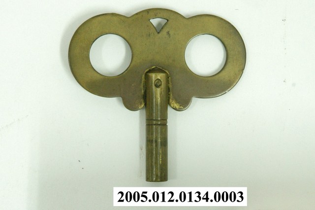 本件發條鑰匙為日本明治時計株式會社製八角木質掛鐘組的部件之3,通身以黃銅製作而成,整體外觀呈現T字形,可分為轉柄與套筒身。轉柄呈現扁平片狀,左右側帶有圓形透孔,中央下方切割一道卡榫。套筒身呈圓柱狀,頂端同樣切割有一道卡榫與轉柄接合固定,筒身帶有2條環型線條,底端為中空筒狀,用來插入掛鐘的發條孔洞,旋轉以上緊發條。