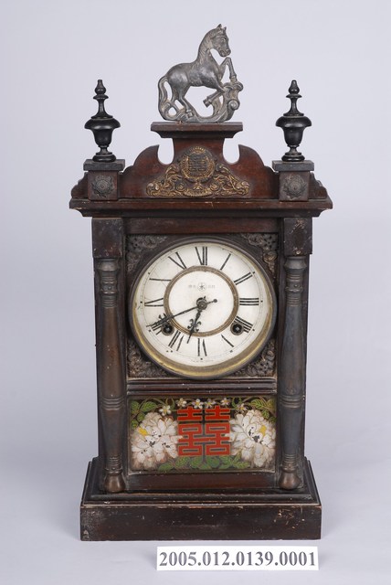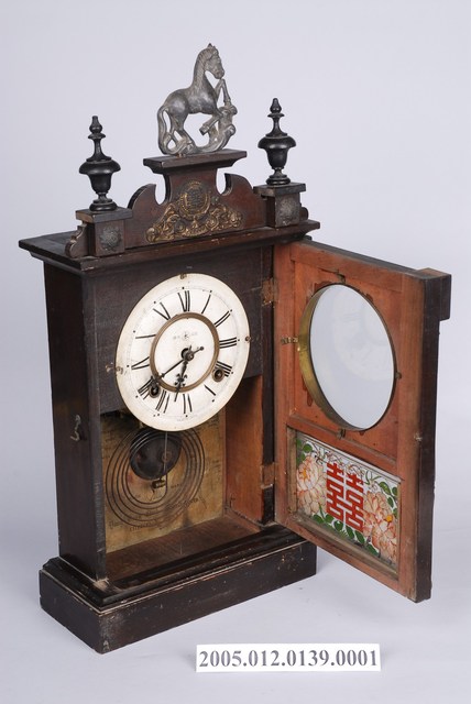中國山東煙臺永康造鐘無限公司製彩繪雙喜牡丹馬頭機械木座鐘,盒體通身以木材製成,外觀呈扁狀長方體,上方頂蓋及下方底座皆為長寬略大於盒體的長方體。盒體正面作單側右開門設計,門框左右對稱飾以立柱,中央開有兩個透孔,上半部圓形孔加裝透明玻璃以顯示時間,下半部方形孔夾帶繪有雙喜牡丹圖樣的透明玻璃。門框與兩孔間的空隙以四枚三角造型銅片填滿,立柱上方原貼有銅飾今已脫落,盒體頂蓋凹槽處插有以馬頭及雙喜為主題的飾件。門內上半部嵌入圓形文字板,文字板中央帶有黃銅圓環,環內印有以同心圓及永字構成的商標,商標左右有文字「註冊商標」。環外繞以羅馬數字用來指示時間,數字IIII(4)及VIII(8)旁有發條孔洞,數字VI(6)下方標有文字「MADE IN CHINA」。文字板後方裝有機芯,機芯下方設有敲鐘裝置,背板處貼有以英文書寫的產品標籤,標籤內含以同心圓及YK組成的商標,YK為永康造鐘無限公司的外文名稱縮寫。