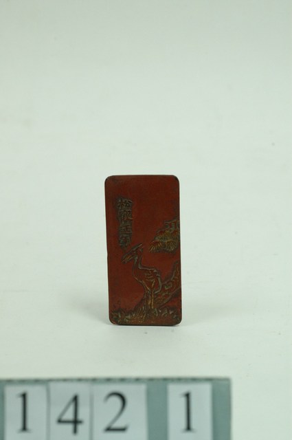 1.本件為朱地雕刻松鶴紋漆盒之盒蓋,盒蓋為長方形木片形狀,通體髹朱漆,內面有卡榫可滑入盒身軌道固定。盒蓋上雕刻有一隻鶴站立於松樹前的草地上,左上方則刻有「松鶴延年」四字。鶴鳥與松樹的刻紋以金漆描繪,惟因年代久遠,金漆已斑駁不清。2.蓬萊塗發展至後期,漆器上造形與圖紋除了蓬萊塗風格,也逐漸發展出具有中國繪畫風格的中日混合樣式。3.臺灣漆器主要是販售給日本觀光客的紀念品或是禮品所用,與日本與中國漆器多為貴族所使用的目的有所差別。因此漆器多採用技法簡單、造形簡潔的方式來製作,同時具有實用及觀賞功能。
