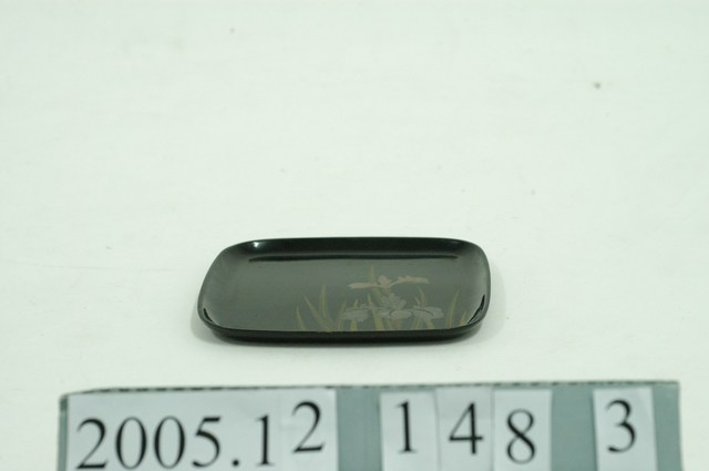 黑地春蘭紋蒔繪漆盤,木胎,正方形,四角圓弧,盤面淺,高約1公分,口略微外闊。髹黑漆,盤面右下角以黃綠色、褐色和白色等顏料描繪出春蘭圖樣,上方與左方留空,生意盎然、精緻典雅。春蘭為日本漆器常見的裝飾題材,象徵春天花開,有芳潔美好之意。