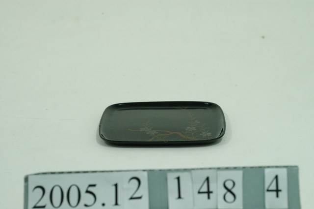 黑地櫻花紋蒔繪漆盤,木胎,正方形,四角圓弧,盤面淺,高約0.9公分,口略微外闊。髹黑漆,盤面右下角以褐色、白色、綠色、粉色等顏料描繪出櫻花圖樣,左上方留空,生意盎然、精緻典雅。櫻花為日本國花,是日本漆器常見的裝飾題材。