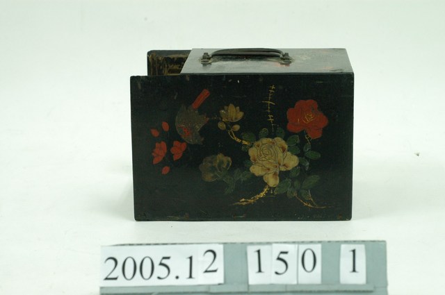 本藏品為五件一組的漆器鏡箱的主體,長20.8公分、寬15.8公分,高14.8公分。通體為黑漆,抽屜內部為紅漆。箱體內部分為三層,最上層為放置鏡子,下方兩層則為抽屜。箱體上方有兩個金屬提把,箱體頂部、側面與背面彩繪有花鳥圖案。