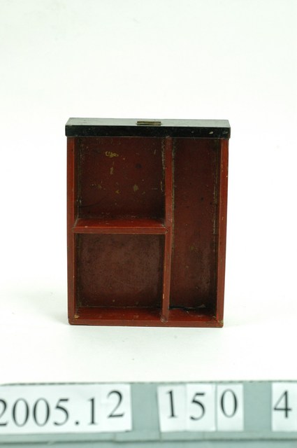 本藏品為五件一組漆器鏡箱兩個內部抽屜中的一個,長14公分、寬18.1公分,高4.3公分。抽屜整體為長方形,前面板為黑漆,其他部分則為紅漆,與另一個抽屜不同,此件裝有格框,分為一大兩小三個部份,方便分類收納。前面板中央有金屬片狀拉把,通體無裝飾,是講究實用的部件。