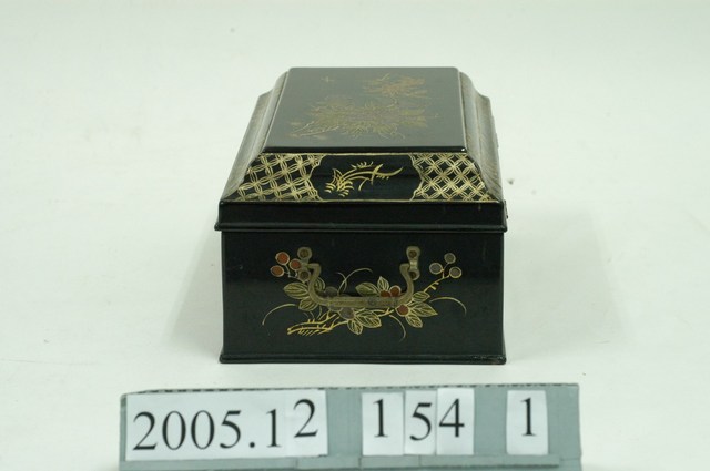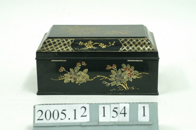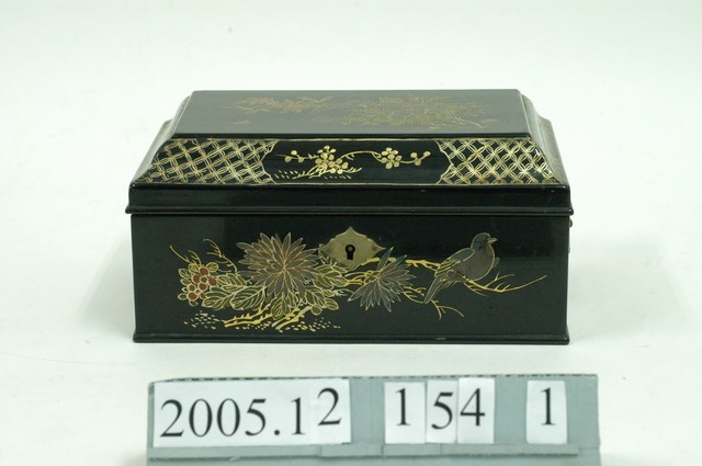 1.本件為黑地描金彩繪花鳥紋漆盒之主盒,木質胎體,長方盒型,盒蓋為梯形斜邊造型,翻蓋設計,下盒有鎖孔開關,盒內四角有四根短木條,可放置托盤形成隔層。漆盒外部髹黑漆,內部髹朱漆。以描金彩繪法表現紋飾,取金漆於盒蓋及側身描繪出花鳥紋及金錢紋線條,再以彩漆填繪,整體造型高貴華美。