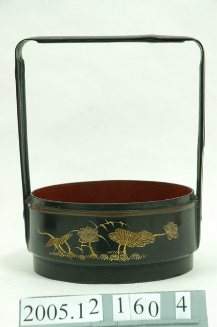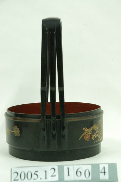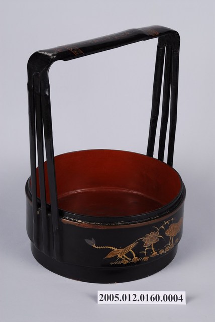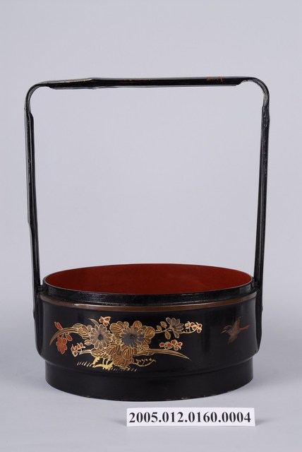 黑地花鳥紋蒔繪三層漆籃底座,木胎,圓筒狀,口沿略內縮向上凸起以承接上層,籃底略內縮形成高足。外髹黑漆,內塗朱漆,層盒外側以金色、藍色、紅色等顏料描繪荷花、菊花、小鳥等圖樣。兩側接三條木片製成提把,提把頂端飾有花卉、線條等紋飾。