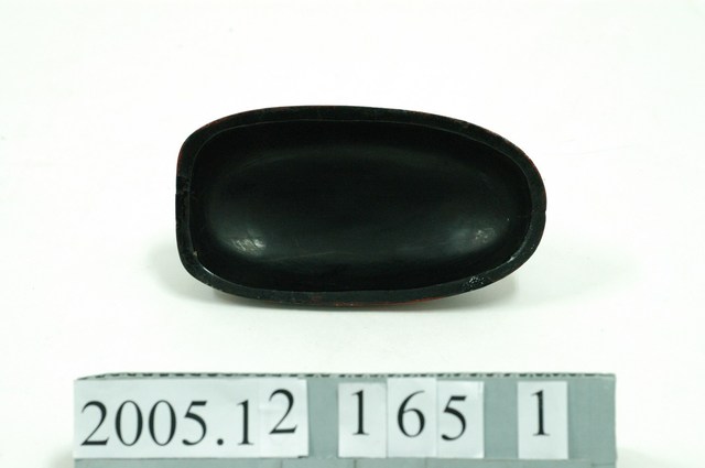 1.本件為朱地黑彩瓜形漆盒之上盒,上盒的內層及上下開闔處髹黑漆。外層表面則髹朱漆為底,並雕刻出瓜果藤蔓紋路後,再以黑漆描繪線條及填色。瓜果紋為中國典型器具裝飾紋樣,有多子多孫之寓意。2.臺灣早期的漆器多自福建,漆器的價格昂貴,是富貴人家才買得起的貴族用品,民間則將漆器用在年節、祭祀方面,如:待客的菓盒、茶盤,祭祀用的貢盤、神像彩繪等,或作為嫁女兒的嫁妝之用。