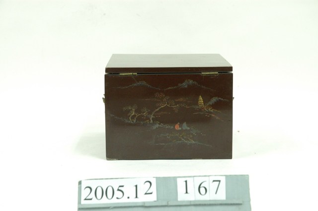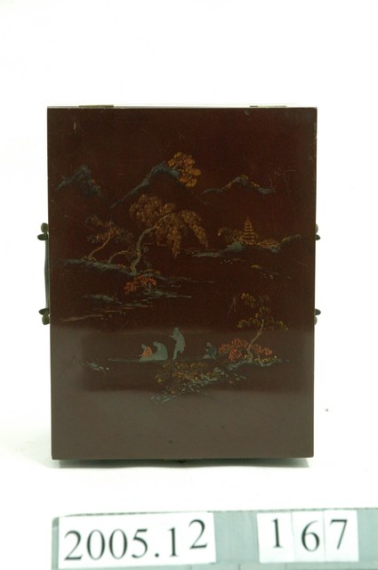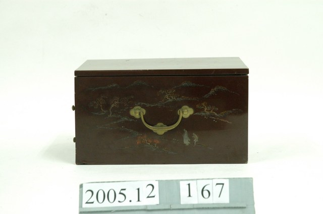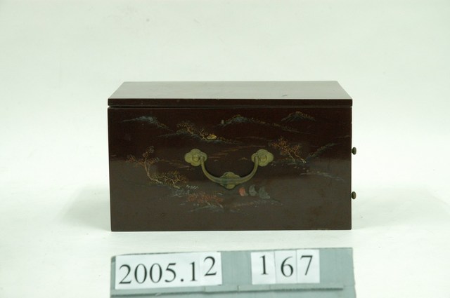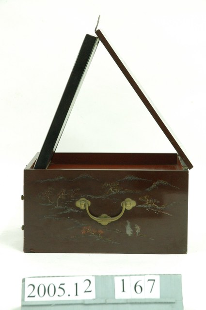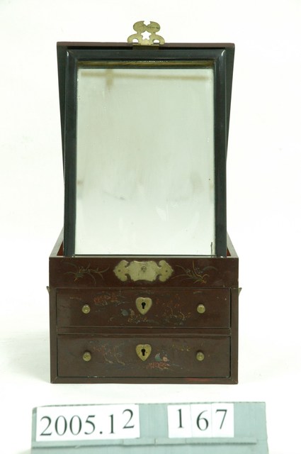 1.本藏品為木製鏡箱,由主體與抽屜共3個部件組成。鏡箱通體由木材製成,正面上部可以收納或固定鏡子,下則有兩個抽屜,左右兩側則有圓形金屬提把。表面皆施以深褐色漆,正面、側面、頂面皆以彩墨配合淺浮雕,刻繪有花草、山水人物等裝飾題材。2.此類鏡箱,又稱為梳妝盒,除附有鏡子之外,多做有小型抽屜,可作為收納化妝用品之用,並附有把手,方便搬運與攜帶,為傳統女性重要的清潔儀容用品。