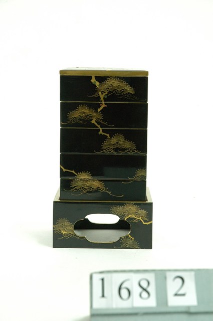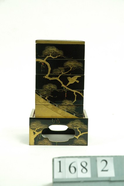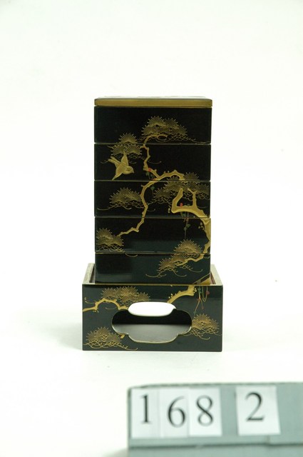 1.本件本金高蒔繪五層漆盒主體,木質胎體,全體髹黑漆為底,最下方為底座,底座四邊的中央皆有花形鏤空,底座上方為五層正方形盒,底座及盒身以日本傳統高蒔繪技法描繪金色公雞、松樹及飛鳥圖紋裝飾,整體風格高貴華美。2.日本過新年會與家人一同吃御節料理,傳統的御節料理會用五層漆盒來盛裝。叫做「五段重」,每層該盛放什麼食物均有嚴格規定。3.高蒔繪是在紋樣上刻意用漆或木炭或漆灰堆高。堆高後再撒上金粉,並研磨表面。高蒔繪相較於其他蒔繪技法,著重在表面的立體感。