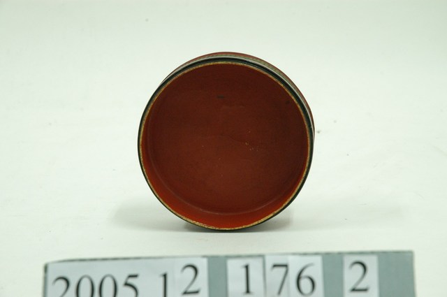 1.本件為竹編描金圓形漆盒下盒,盒身的外層為竹編,內層為木製,竹編的上下緣則分別以兩道朱黑漆裝飾。2.臺灣早期的漆器多自福建,漆器的價格昂貴,是富貴人家才買得起的貴族用品,民間則將漆器用在年節、祭祀方面,如:待客的菓盒、茶盤,祭祀用的貢盤、神像彩繪等,或作為嫁女兒的嫁妝之用。