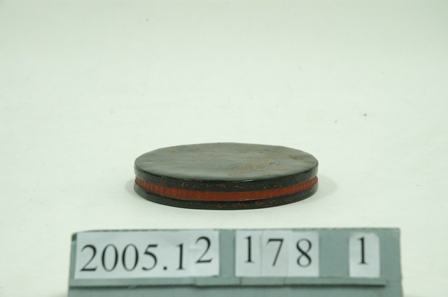 1.本件松鶴竹胎圓漆盒上蓋,竹胎,圓形,內層有木製底板並髹黑漆,外層竹編部分則髹朱漆,盒蓋上方鑲可覆蓋整個盒面的黑漆圓板,圓板上以金漆與朱漆繪有松鶴及花卉紋飾,松鶴左方寫有「當朝」二字以及其他文字,惟漆以剝落,難以辨識,盒蓋上下緣以竹片圈起固定,塗黑漆,並繪上藤蔓紋做為裝飾。2.臺灣早期的漆器多自福建,漆器的價格昂貴,是富貴人家才買得起的貴族用品,民間則將漆器用在年節、祭祀方面,如:待客的菓盒、茶盤,祭祀用的貢盤、神像彩繪等,或作為嫁女兒的嫁妝之用。