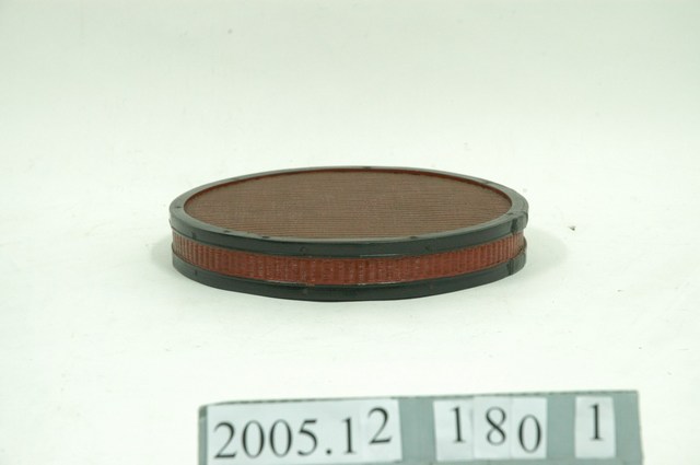 1.本件竹編圓漆盒上蓋,外層為竹編,內層有木製底板,漆盒內部髹黑漆,外層竹編部分則髹朱漆,盒蓋上下邊緣分別以竹片圈起固定,並塗上黑漆裝飾。2.臺灣早期的漆器多自福建,漆器的價格昂貴,是富貴人家才買得起的貴族用品,民間則將漆器用在年節、祭祀方面,如:待客的菓盒、茶盤,祭祀用的貢盤、神像彩繪等,或作為嫁女兒的嫁妝之用。