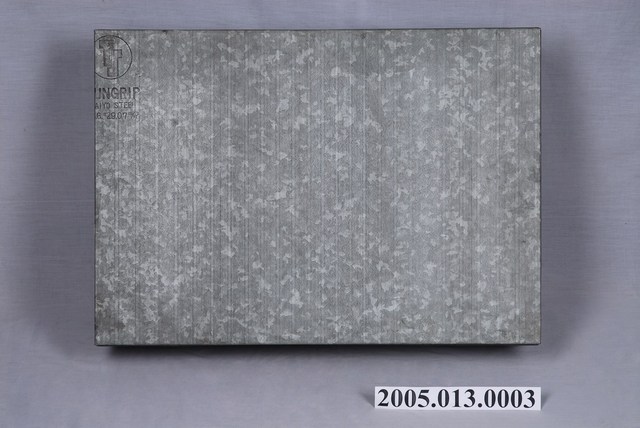 1.本件亞鉛方盒可分為盒蓋與盒身2部件,通身以亞鉛板裁剪焊合製作而成,外型作扁狀長方形盒,表面呈銀灰色,並帶有片狀的金屬光澤。盒蓋口部略大於盒身,短蓋壁,作套蓋樣式,另口緣處帶有圓唇。蓋面一端角印有黑色圓環形ST字樣商標、商品名稱與規格。盒身處短邊側面各焊有圓形環做提把使用。2.亞鉛二字由日本漢字而來,為中文「鋅」之意,臺灣從日治時期即沿用至今。亞鉛為鋼鐵板材於表面電鍍鋅,利用鋅的特性,可抗腐蝕,又能隔絕氧氣和水,達到防鏽的目的。為臺灣日治時期至戰後的普遍民生用具材料,可製作各式各樣器具。1980年代左