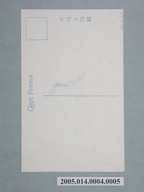 2.正面影像滿版印刷,上方印有紅色說明文字「(台灣)生蕃人頭目禮裝(ツオーオ族)、240 TSUOU SAVAGE FULLDRESS, FORMOSA.」。背面則印有藍色文字「郵便ハガキ、CARTE POSTALE、生蕃屋商店發行」。