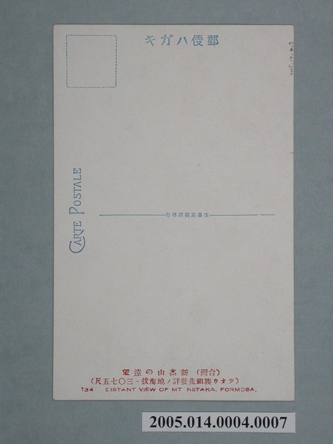 2.正面影像滿版印刷,無文字。背面則印有藍色文字「郵便ハガキ、CARTE POSTALE、生蕃屋商店發行」,以及紅色說明文字「(台灣)新高山の遠望(ツオウ族祖先發祥ノ地海拔一三o七五尺)、134 DISTANT VIEW OF MT NIITAKA, FORMOSA.」(譯:新高山遠望,鄒族祖先的發祥地,高13075日尺)。