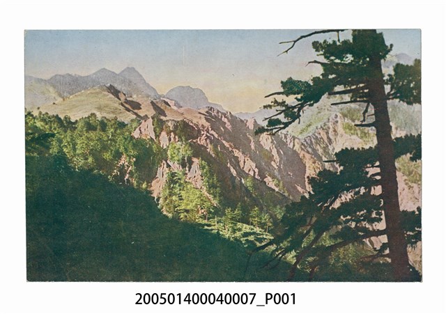 1.生蕃屋商店發行之多色印刷明信片,影像內容為從南投東埔入山、攀登新高山途中,於觀高附近所見的新高主山、新高東山等群峰,前方大崩壁為金門銅斷崖。
