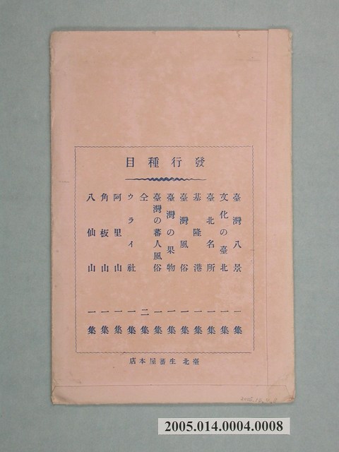 封套採單色印刷,封面為一名持獵槍的原住民蹲著,做狙擊姿態,背景為高山,上有藍色文字「原色板、臺灣蕃人風俗集、台灣生蕃屋商店發行」 。背面為發行目錄,計有臺灣八景、文化的臺北、臺北名所、基隆港...等12種,最下方標記為「臺北生蕃屋本店」。