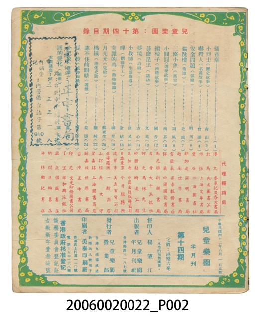 1.本件為《兒童樂園》第14期,彩色印刷,內容有歷史故事、名產故事、保健、常識、寓言、選舉故事、滑稽故事、謎語、詩歌、生活指導等等。2.《兒童樂園》創刊於1953年1月,至1995年因為經濟問題停刊,於香港共出版1006期的兒童半月刊。全書彩色印刷,內容包含歷史故事、世界童話等等,取材新穎、內容健康。