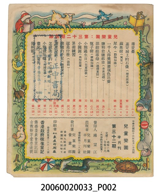 1.本件為《兒童樂園》第32期,彩色印刷,內容有歷史故事、寓言、動物知識、世界巡禮、連環童話、植物知識、兒童詩歌、典型故事、算術練習等等。2.《兒童樂園》創刊於1953年1月,至1995年因為經濟問題停刊,於香港共出版1006期的兒童半月刊。全書彩色印刷,內容包含歷史故事、世界童話等等,取材新穎、內容健康。