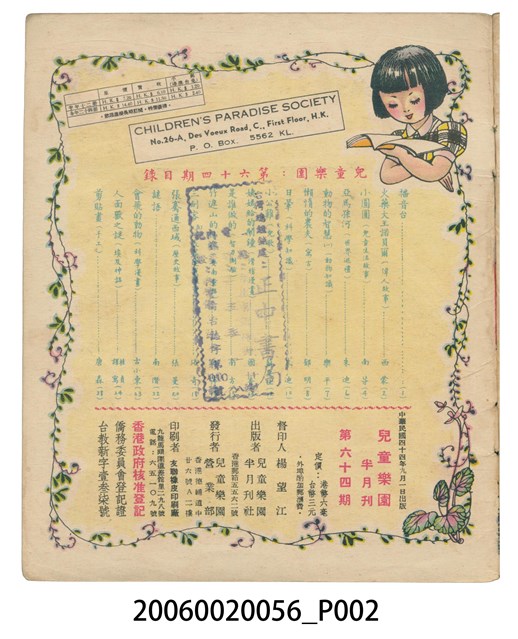 楊望江督印、兒童樂園半月刊社出版、兒童樂園營業部發行、友聯橡皮印刷廠印刷