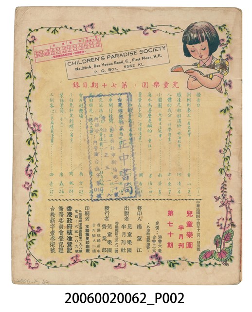 楊望江督印、兒童樂園半月刊社出版、兒童樂園營業部發行、友聯橡皮印刷廠印刷