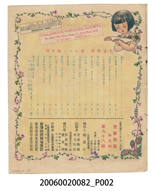 1.本件為《兒童樂園》第98期,彩色印刷,內容有中國神話、兒童生活故事、媽媽講故事、新年趣劇、世界巡禮、外國故事、童話、科學知識等等。2.《兒童樂園》創刊於1953年1月,至1995年因為經濟問題停刊,於香港共出版1006期的兒童半月刊。全書彩色印刷,內容包含歷史故事、世界童話等等,取材新穎、內容健康。