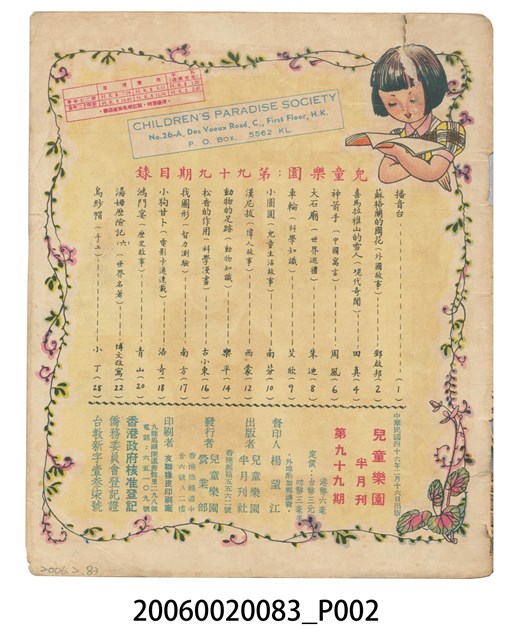 1.本件為《兒童樂園》第99期,彩色印刷,內容有外國故事、現代奇聞、中國寓言、世界巡禮、科學知識、兒童生活故事、偉人故事、動物知識等等。2.《兒童樂園》創刊於1953年1月,至1995年因為經濟問題停刊,於香港共出版1006期的兒童半月刊。全書彩色印刷,內容包含歷史故事、世界童話等等,取材新穎、內容健康。