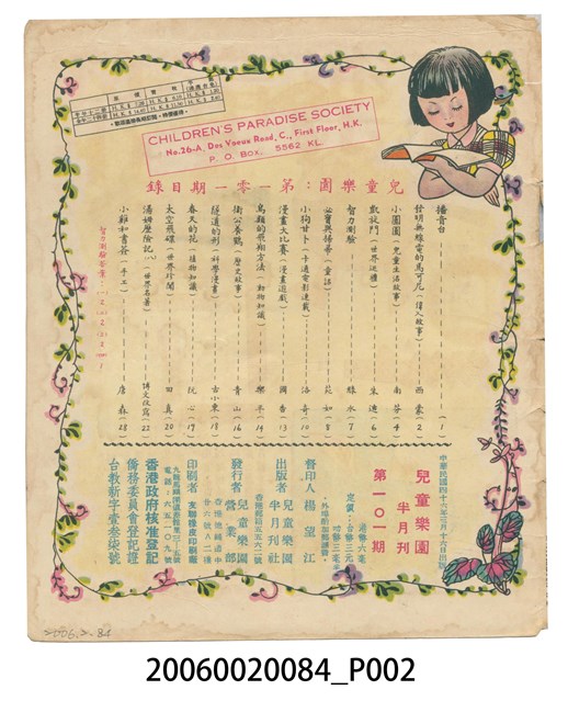 1.本件為《兒童樂園》第101期,彩色印刷,內容有偉人故事、兒童生活故事、世界巡禮、智力測驗、童話、卡通電影連載、漫畫遊戲、動物知識等等。2.《兒童樂園》創刊於1953年1月,至1995年因為經濟問題停刊,於香港共出版1006期的兒童半月刊。全書彩色印刷,內容包含歷史故事、世界童話等等,取材新穎、內容健康。
