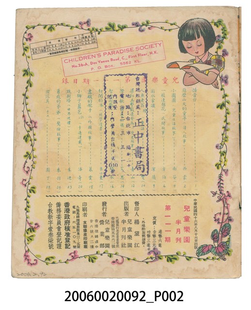 楊望江督印、兒童樂園半月刊社出版、兒童樂園營業部發行、友聯橡皮印刷廠印刷