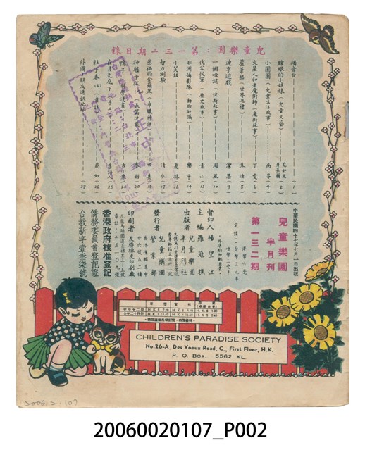 楊望江督印、羅冠樵主編、兒童樂園半月刊社出版、兒童樂園營業部發行、友聯橡皮印刷廠印刷