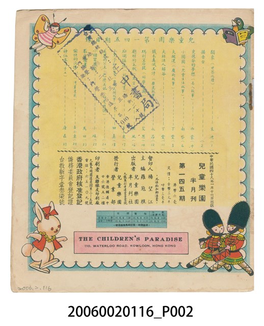 1.本件為《兒童樂園》第145期,彩色印刷,內容有世界巡禮、名人故事、兒童生活故事、魔術故事、歷史故事、科學知識、寓言、科學漫畫等等。2.《兒童樂園》創刊於1953年1月,至1995年因為經濟問題停刊,於香港共出版1006期的兒童半月刊。全書彩色印刷,內容包含歷史故事、世界童話等等,取材新穎、內容健康。53年至1995年於香港共出版1006期的兒童半月刊。