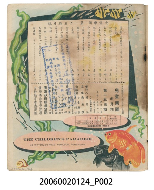 楊望江督印、羅冠樵主編、兒童樂園半月刊社出版、兒童樂園營業部發行、友聯橡皮印刷廠印刷