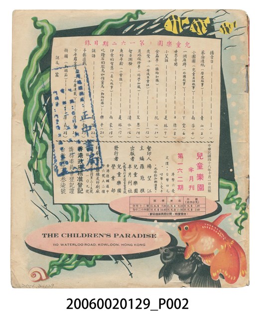 1.本件為《兒童樂園》第162期,彩色印刷,內容有歷史故事、兒童生活故事、外國故事、世界奇聞、植物知識、安徒生童話、科學知識等等。2.《兒童樂園》創刊於1953年1月,至1995年因為經濟問題停刊,於香港共出版1006期的兒童半月刊。全書彩色印刷,內容包含歷史故事、世界童話等等,取材新穎、內容健康。53年至1995年於香港共出版1006期的兒童半月刊。